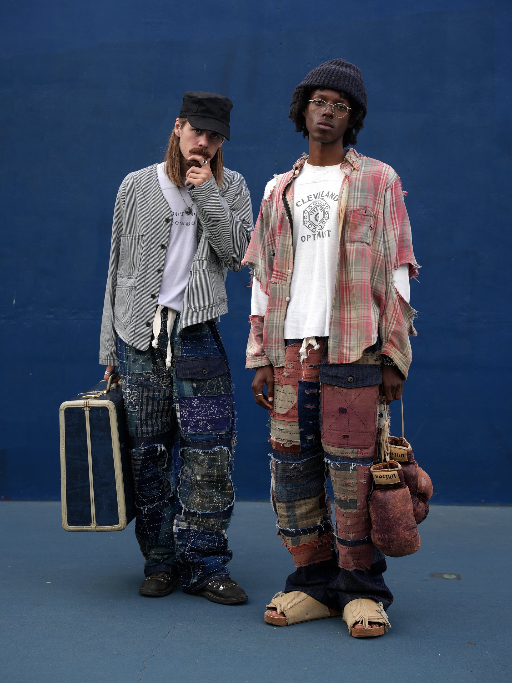 A re-imagination Cotton Cowboy's signature CC-53 Trouser, the Composted* CC-53 (CCC-53 "OTTB") draws inspiration from my love for organic growth and entropy through folk patchwork. Hand crafted using a considered curation of vintage and antique Japanese textiles over a raw 12oz Japanese denim, this 1 of 1 piece was meticulously hand distressed and features embroidery style sashiko embellishment. Intended to accommodate a variety of body types, these pants are oversized and feature a drawstring waist, and are lined with cotton for comfort and durability.